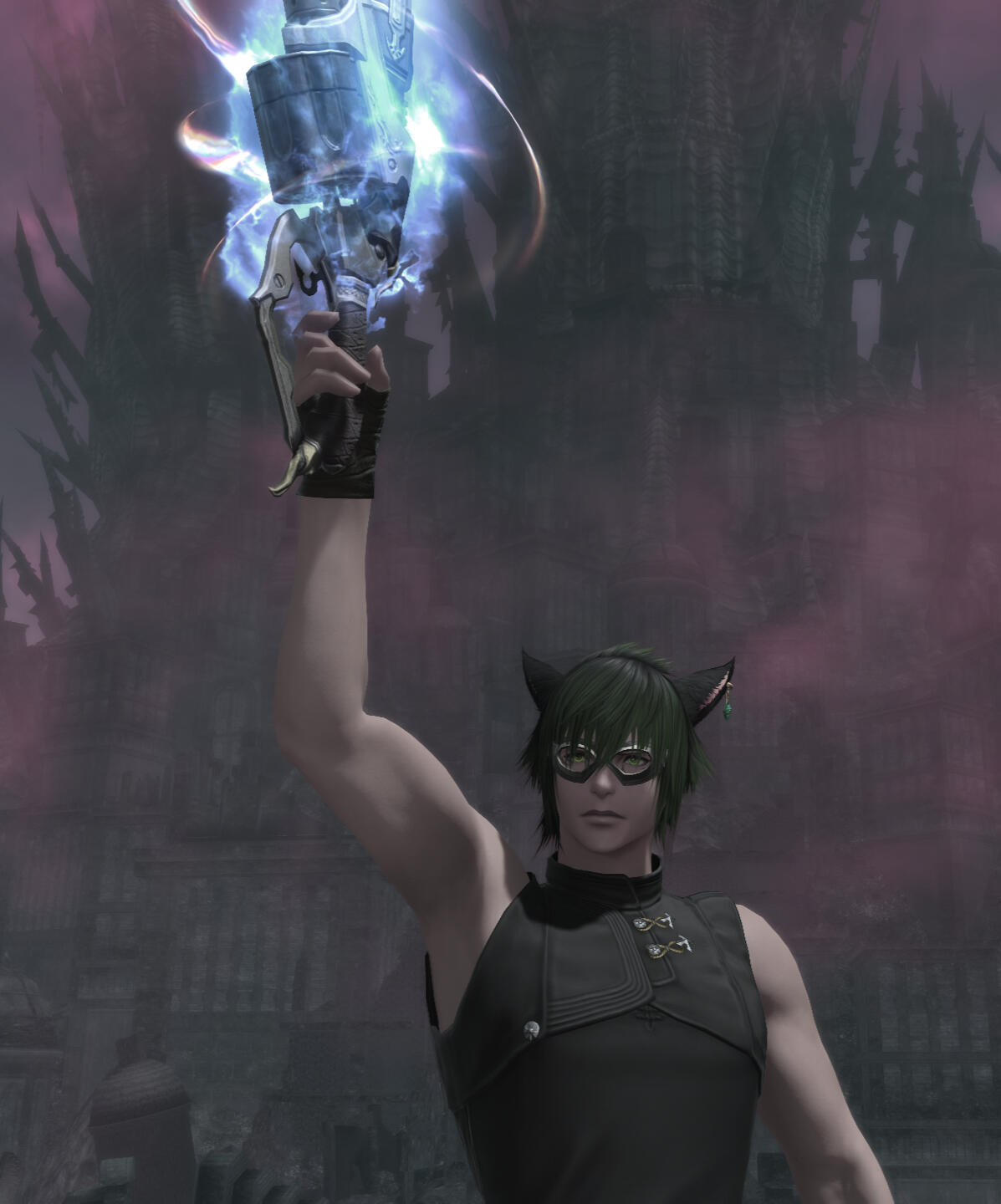 After Reks had dismissed himself from the meeting at the Coven he went straight to his Cafe as he was instructed by the voice on the other end of the linkshell. When he arrived he frowned as a letter in familiar handwriting had been left in his mailbox. He knew exactly who it was from and knew it meant he was to be sent on an errand. He sighed softly to himself and opened the sealed letter, to reveal what his target was. The instructions were for him to steal an artifact in Ok’Zundu, the Vanu Vanu village, in the Sea of Clouds. The object apparently contained an abnormal amount of Aether that the Vanu Vanu were unaware of, “Makes sense why they’d want something like this.” As with all his communiques from his Ascian contacts he muttered a spell under his breath and set the letter aflame. Reks was not particularly gifted in the arts of magick but he did know a few simple spells that came in hand from time to time. Overall his specialty with magick was to Imbue the machinery and weaponry he tinkered with and made himself with magickal attributes. Getting to the Vanu Vanu village was not difficult for him to do, it was quite a fast ride by airship. Finding a crew with a smaller airship was not too difficult, but convincing them to keep his business secret was a little more difficult. He had paid for the uncharted airship to wait for him just outside the Vanu Vanu village and be ready for a speedy getaway should things go awry. He had also bribed the crew a substantial sum to maintain their silence about his venture, the last thing he needed was the prying eyes of the Warriors of Light or some other governmental officials looking into the matter.It was about mid-day by the time he found himself at the drop off location outside the village. Upon entering the village he did his best to remain hidden. If he was discovered it would be that much harder to accomplish his task. He made his way to the Chieftain's house, where the object was said to be. Luckily for him the Chieftain's hut was rather exposed and the Chieftain himself was nowhere to be seen, “Must be out on official business, this makes my job easier.” he stated. The Vanu Vanu did not think outsiders would take any interest in their artifacts so the hut itself remained unguarded. It was as if the stars were aligning to make Reks’ task as easy as possible, a welcome change of pace. He carried with him a short staff, which had been made to the specifications of the object he was meant to steal, a replica to replace the original. It didn’t take him very long to find what he was looking for when he searched the hut. He carefully swapped the staves, placing the replica on the pedestal and sneaking out of the hut before he could have the chance to be seen. Leaving the village was a bit more of a task then entering had been but he managed to sneak away undetected, a perfect score. When he was a fair distance away from the Village he pulled out a purple crystal, that was just small enough to fit in his hand. The Ascians had given the crystal to him when he made his contract with them, it would summon a portal that he would use to hand over any relics or items that the Ascians required for their schemes. He made a soft sigh as the dark portal opened before him and he unceremoniously tossed the staff into the portal. A few moments later the portal shut, which meant he was done with his task.On his way back to the airship, He heard the howling and screeching of what sounded like a cat. His ears perked up as he investigated the noise. A rather large Sanuwa was hovering over what looked like a little Gaelikitten. The Gaelikitten’s wing device it wore seemed busted, the Sanuwa must have broken it and was about to claim the poor creature as a midday snack. The lesson earlier on familiars suddenly popped into his mind, he had forgotten how exactly the bond was to be formed, but a Gaelikitten would make a wonderful familiar. As the winged snake-like creature was about to eat the terrified Gaelikitten Reks swooped in and kicked the creature, forcing it to the side and miss its lunge. Reks pulled out his Machina Revolver and started firing off some imbued rounds at the creature. It’s shrieks of pain filled the air and it didn’t take much more for it to become dis-interested in the two and scampered off for its own safety. Reks approached the Gaelikitten which hissed at him with every step he took towards it. He kneeled down by the Gaelikitten and reached for it. The Gaelikitten hissed loudly and bit into Reks’ arm, it’s claws also digging into his arm. Reks winced in pain but did his best to ignore it as he set to work on repairing the Gaelikitten’s wing, muttering some spell under his breath to imbue the wings with increased flying speed and durability once the repair was done. He pulled his arm away which the Gaelikitten reluctantly let go of. The Gaelikitten looked up at Reks in confusion, was the being not going to eat it? It took a few moments before the Gaelikitten realized that the broken wing had been repaired, “Mew?”Reks smiled down at the little creature, who seemed to be in awe that the wing was now repaired. The Gaelikitten took flight to test out the mechanical wings and almost flew away. After a few moments the Gaelikitten hovered in place then returned to Reks, who was still kneeling. The Gaelikitten approached cautiously, gently pawing at the bite and scratch marks that it had left on his arm. It seemed apologetic for it’s behavior, after the kindness Reks had shown to it, ‘Maybe not all beings are bad…’ it thought. Reks smiled down at the little creature, “Well then, how would you like to be my Familiar little guy?” The Gaelikitten turned it’s head as if it were pondering and then gave a soft “Mew” of acceptance. Reks seemed delighted at the creature's response, “Alright then! From now on I’m going to call you Kyma, in Al Bhed it means Gale.” he explained to the creature, who seemed